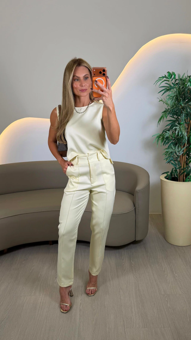 Esse conjunto é ideal para criar looks elegantes e sofisticados, perfeitos para o trabalho ou eventos formais. Combine com scarpins ou sapatos sociais para um visual alinhado e profissional. Aposte em acessórios minimalistas para manter o equilíbrio e a elegância. Para um toque moderno, adicione uma bolsa estruturada e um blazer, se desejar.