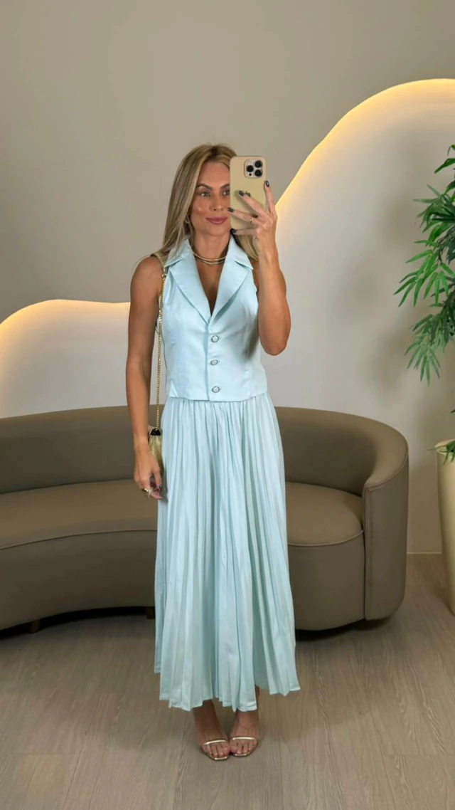 O conjunto de saia midi plissada e blusa de botões é a união perfeita entre delicadeza e sofisticação. A saia, com seu caimento leve e movimento fluido, valoriza a silhueta e traz um toque romântico e elegante ao visual. A blusa de botões complementa com um ar clássico e atemporal, podendo ser usada tanto de forma mais formal quanto despojada, dependendo da proposta. A combinação das duas peças resulta em um look versátil, que pode ser usado em ocasiões especiais, no trabalho ou até em momentos casuais, sempre transmitindo charme, feminilidade e muito estilo.