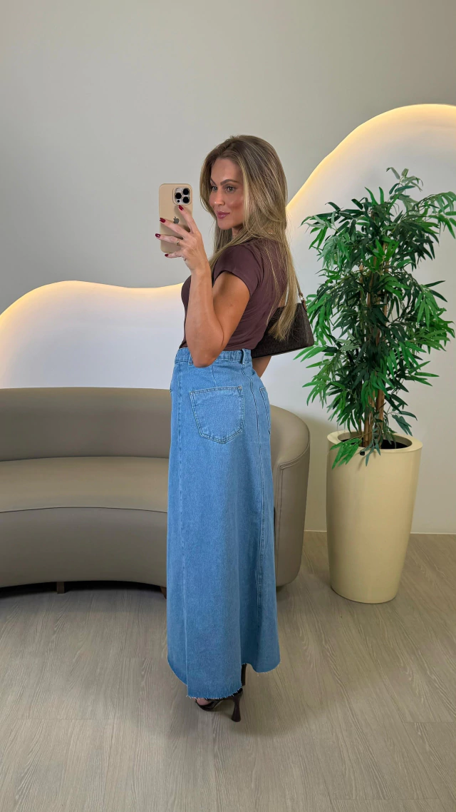 Saia midi jeans com bolsos frontais que adicionam um toque funcional e cheio de estilo. O fechamento por botões na parte da frente traz um detalhe clássico e prático, facilitando o uso. O comprimento midi da saia confere uma estética clássica e sofisticada, atingindo geralmente abaixo do joelho e acima da panturrilha. Versátil e atemporal, essa saia é perfeita para compor looks desde os mais casuais até os mais elaborados. Uma peça curinga que combina com diversas ocasiões e estilos.