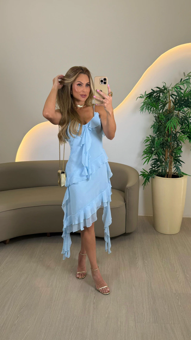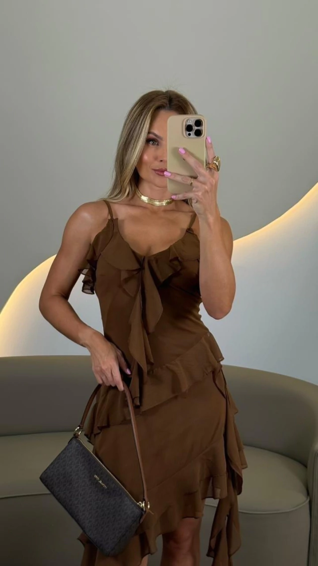 Vestido curto em chiffon leve e esvoaçante, com alças finas que valorizam os ombros e proporcionam delicadeza ao visual. Os babados pontas nas laterais adicionam movimento e charme à peça, enquanto o fechamento por zíper lateral garante praticidade e caimento perfeito. O caimento fluido valoriza a silhueta e confere conforto, enquanto o design feminino traz charme e sofisticação à peça. Ideal para ocasiões especiais, passeios ou eventos que pedem um look romântico e elegante, unindo leveza e estilo em cada detalhe.