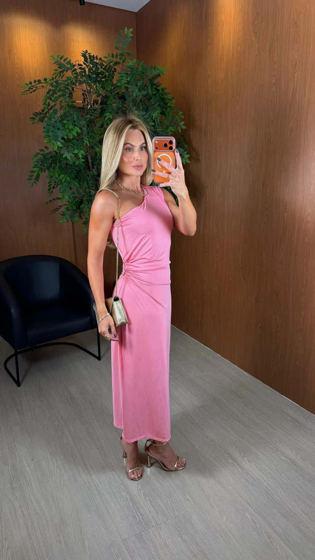 Vestido midi ombro único em poliamida, elegante e moderno, com caimento que valoriza a silhueta. O detalhe do broche na lateral adiciona um toque sofisticado e diferenciado, tornando a peça perfeita para eventos especiais ou ocasiões que pedem um look feminino e cheio de estilo.